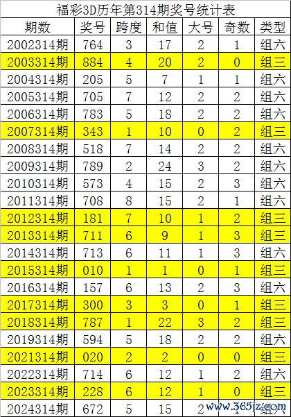 从以上统计不错看出,积年3D第314期开出了9次组三号码,开出了13次组六号码。组三号码和组六号码基本相配,本期预测开出组六号码。