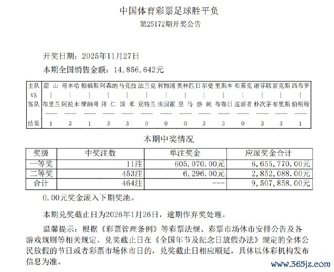 北京工夫11月27日,输赢彩第25172期开奖效果揭晓。本期14场1等开出11注,单注奖金60.5万;14场2等开出453注,单注奖金6296元。本期任九开出3888注,单注奖金2406元。本期足彩销量为14,856,642元,任九投注总数为14,617,764元