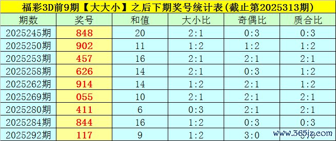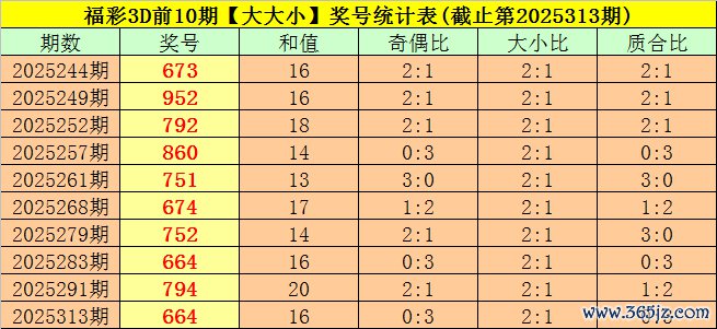 二、福彩3D上期开出奖号664,奖号大小比为2:1,大小类型开出【大大小】,该类型组合奖号在前9次永别开出号码:673-952-792-860-751-674-752-664-794;